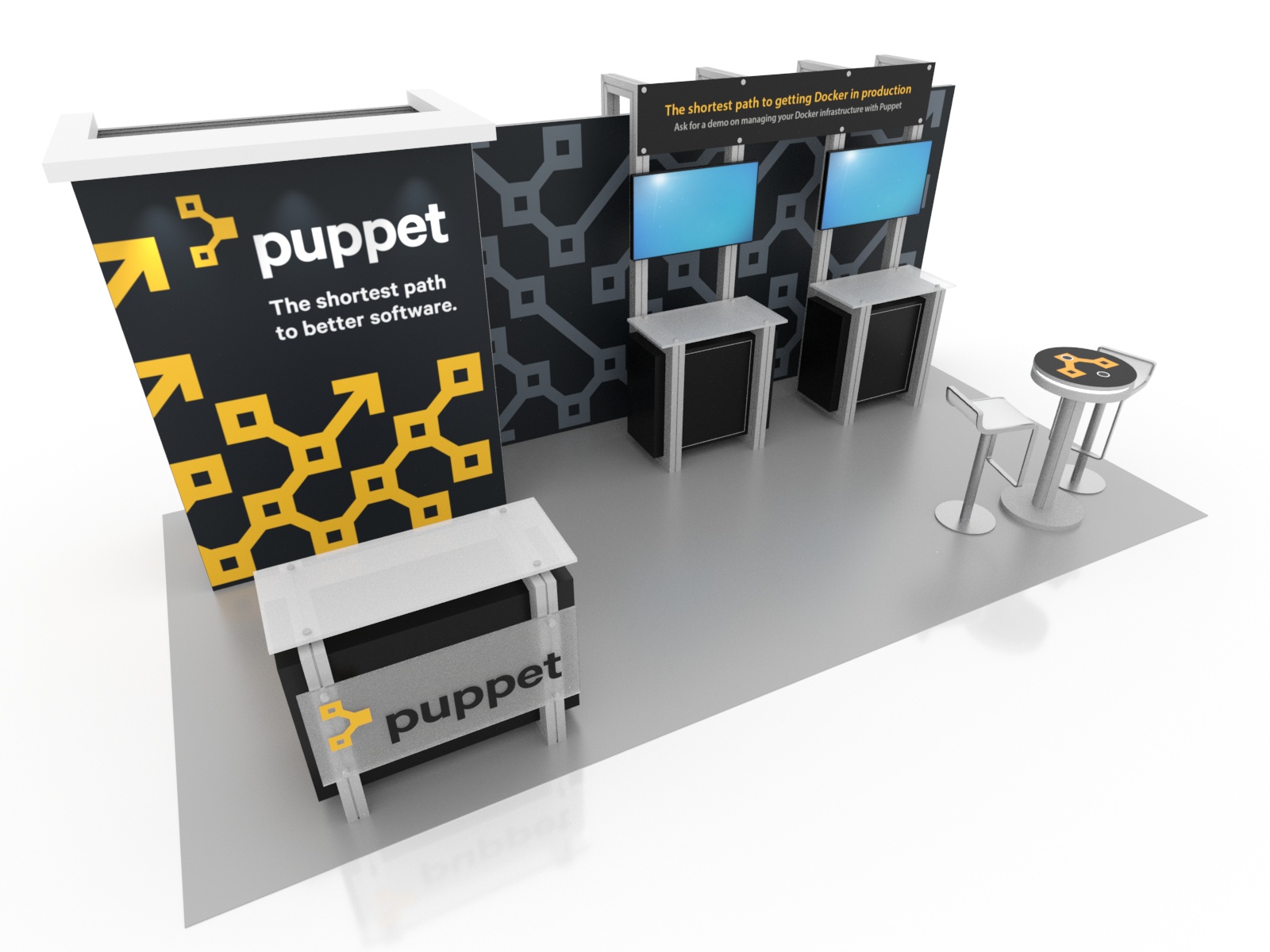 The Gravitee VK-1316 and VK-2911 blend elegance, power, and functionality into an easy-to-assemble modular exhibit. The designs offer substantial branding space on the backwall, workstations, and counters and come with convenient storage both on the counters and in a full-size closet. The monitor(s) and charging stations invite attendees to chat and interact with the trade show staff in a casual environment. Best of all, you'll be pleasantly surprised by how quickly the Gravitee One-Step Modular Walls assemble and how compactly they pack.