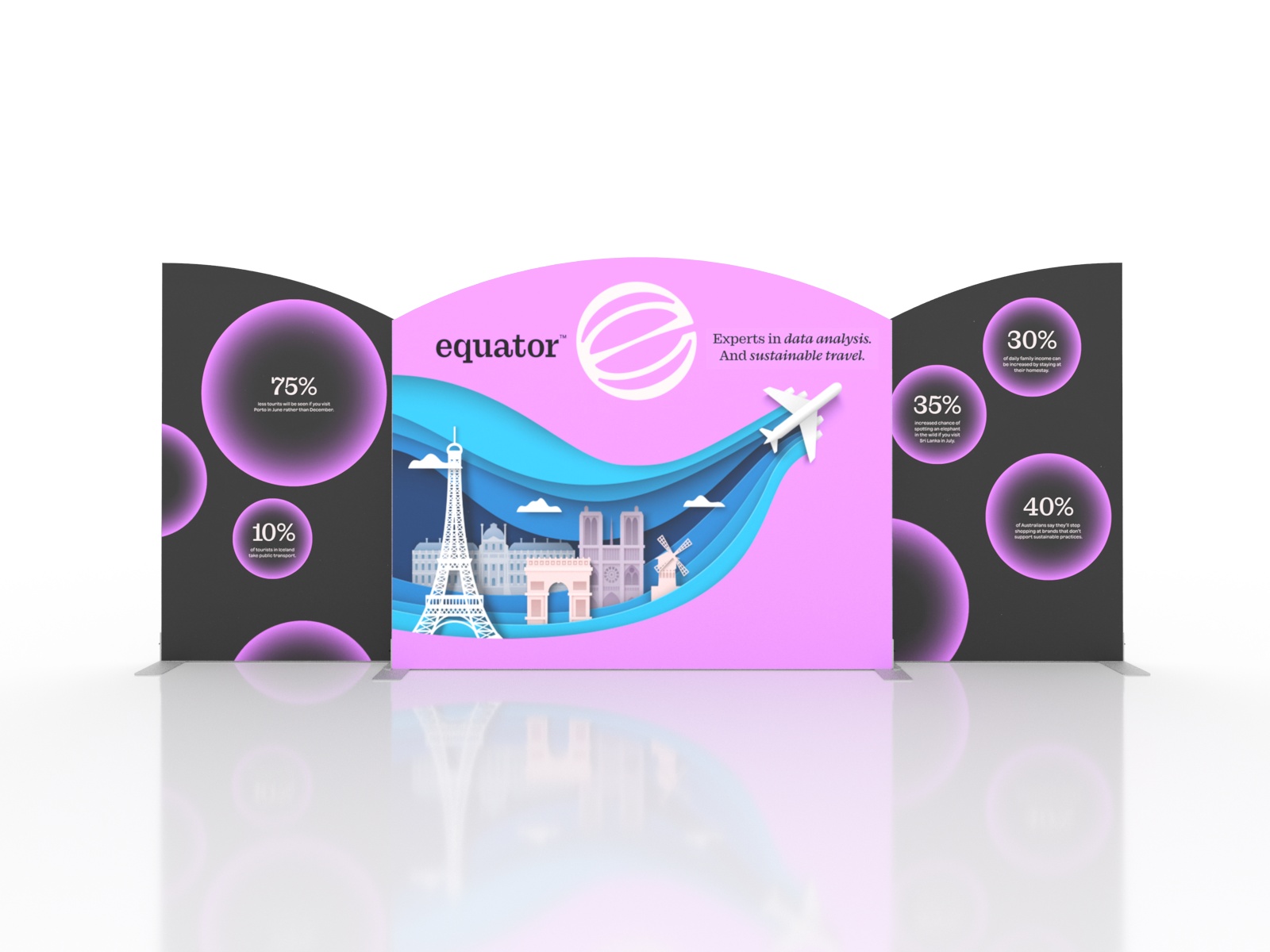 Personalize your Symphony Display with attractive counters, workstations, floating graphics, iPad clamshells, and monitor mounts. The lightweight aluminum frames are engineered for SEG dye-sublimated fabric graphics for a seamless, wrinkle-free look. Add floating graphics for additional visual layering and branding.