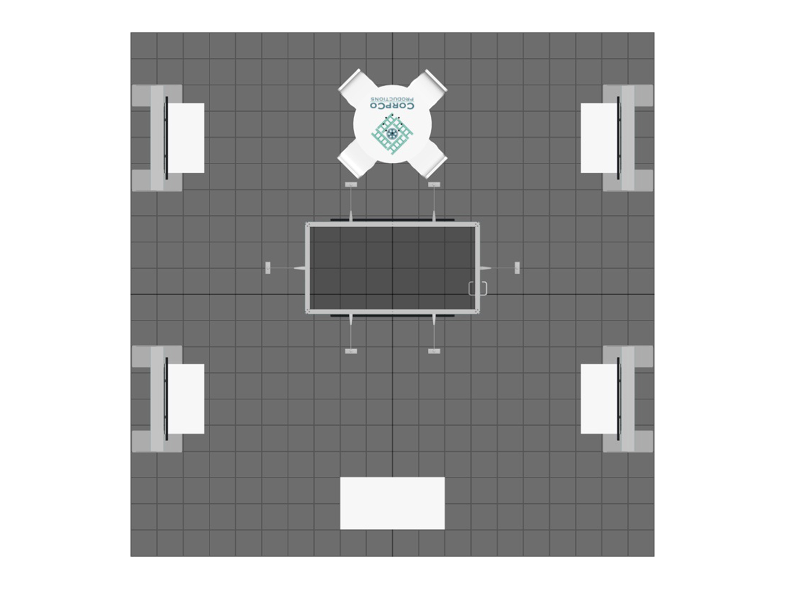 You have options when renting an island exhibit… lots of options. Even something as straightforward as the location of a tower. The RE-9206, RE-9207, and RE-9208 series illustrates this flexibility. In the RE-9208, the 12 ft. tower is positioned toward the back of the booth with forward facing demo stations, reception counter, and charging table. The RE-9206 positions the tower in the middle of the booth so backlit graphics face the aisle and demo stations are in the interior.