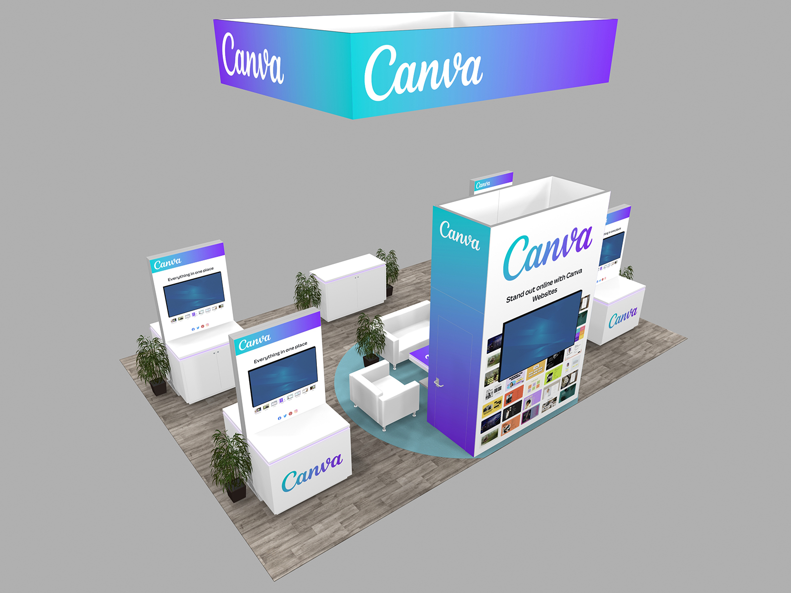 Comfortable and productive are rarely used together to describe a trade show exhibit design. Yet, the VK-5216, VK-5218 and VK-5218 series of 20 x 30 islands are perfect examples of how design can blend these two concepts into a stylish booth. They feature large format fabric graphics with backlighting, demo stations, and multiple monitors, The VK-5216 and VK-5217 have ceiling canopies with scrim fabric, whereas the VK-5218 has a rectangle hanging sign for increased visibility.
